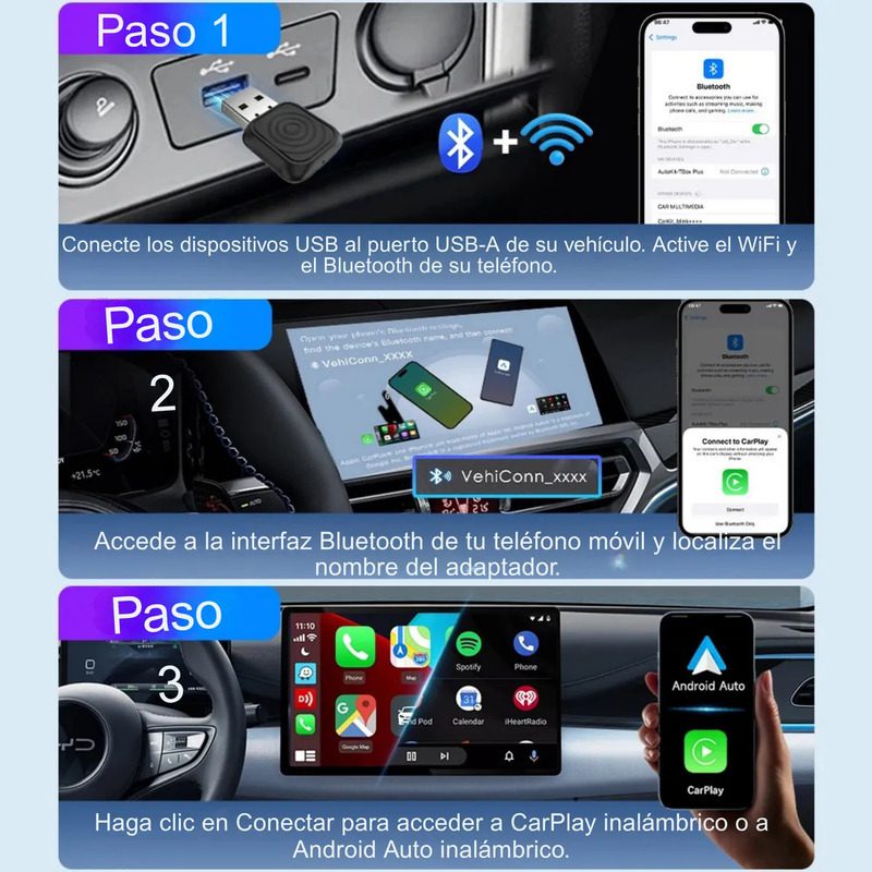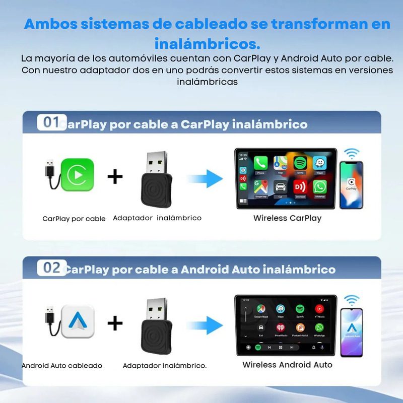 Convertí tu sistema CarPlay o Android Auto en inalámbrico y olvidate del cable para siempre. Funciona con todos los vehículos que ya tienen estas funciones de fábrica.