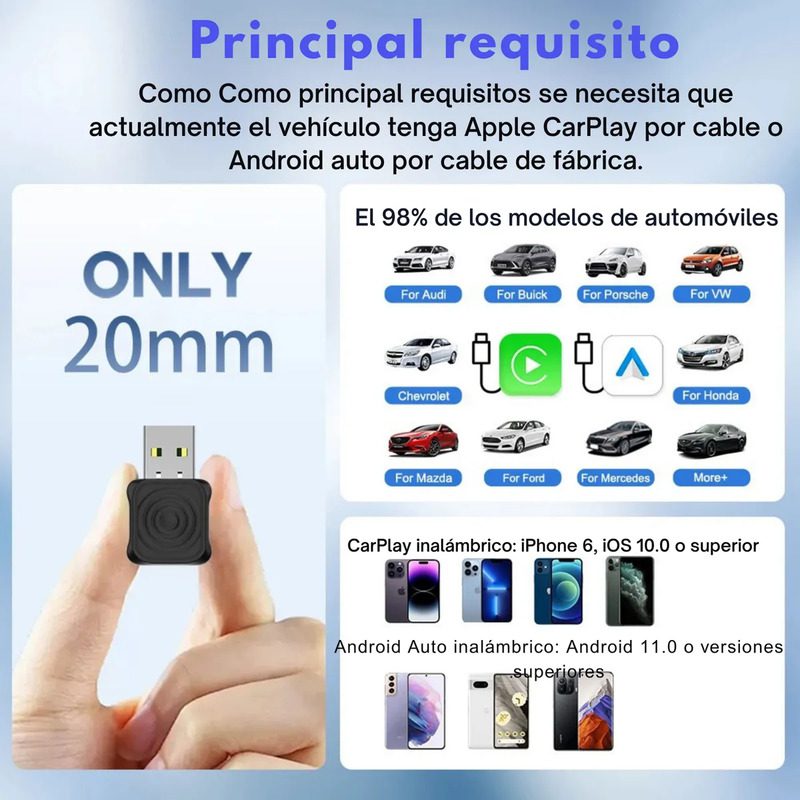 Compatible con todos los autos que tengan CarPlay o Android Auto con cable de fábrica.